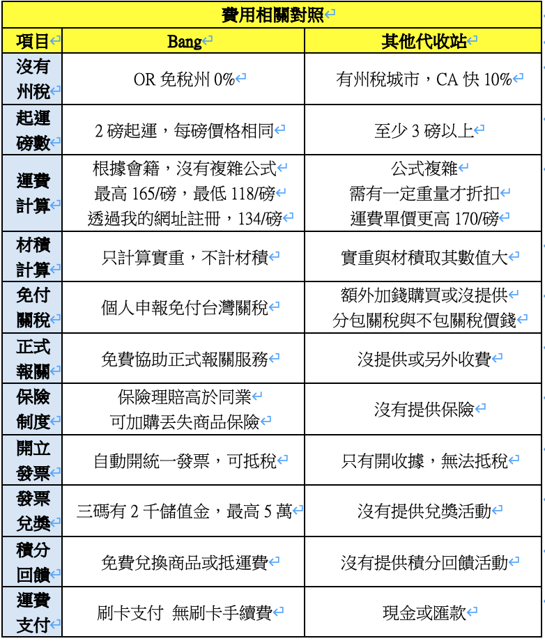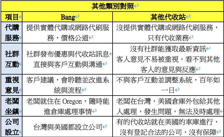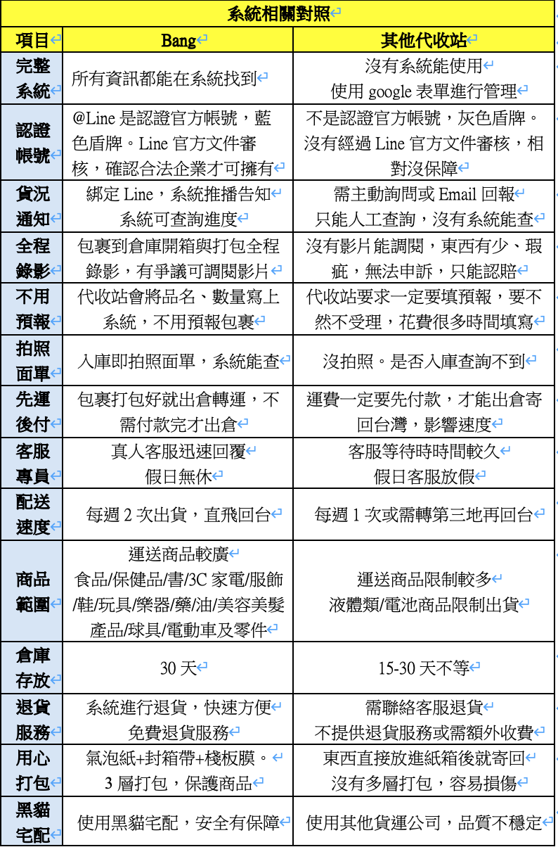 我自己也有使用此代收站,以下是我實際使用與本次採訪David跟員工後,整理出BANG與其他代收站對照差異處。
