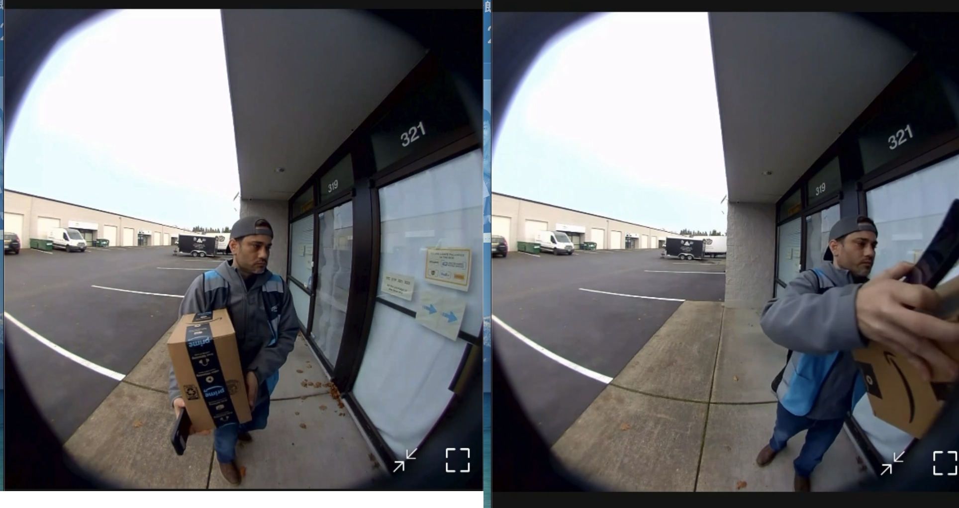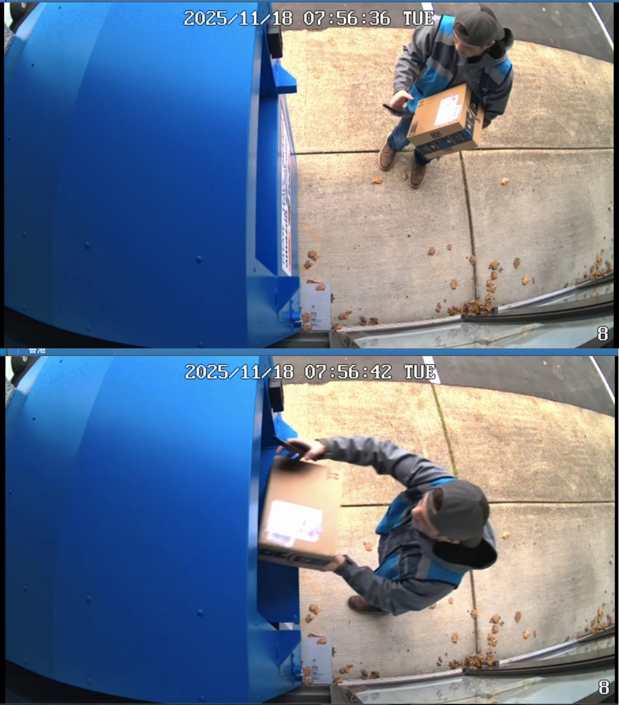 實際送達影片截圖。透過兩個攝影頭紀錄投遞包裹過程,都有記錄時間點,後續有爭議能有影片提出申訴