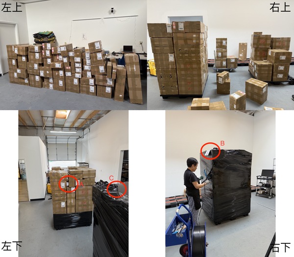 左下:棧板膜封托盤:如同之前寫的特點,他們用心程度除了包裹內的產品會用紙箱或氣泡紙保護,紙箱用封箱膠帶強化,最後所有包裹上托盤,再上一次棧板膜。透過多層次強化,確保箱內物品不會損傷。這張圖片請看兩個細節